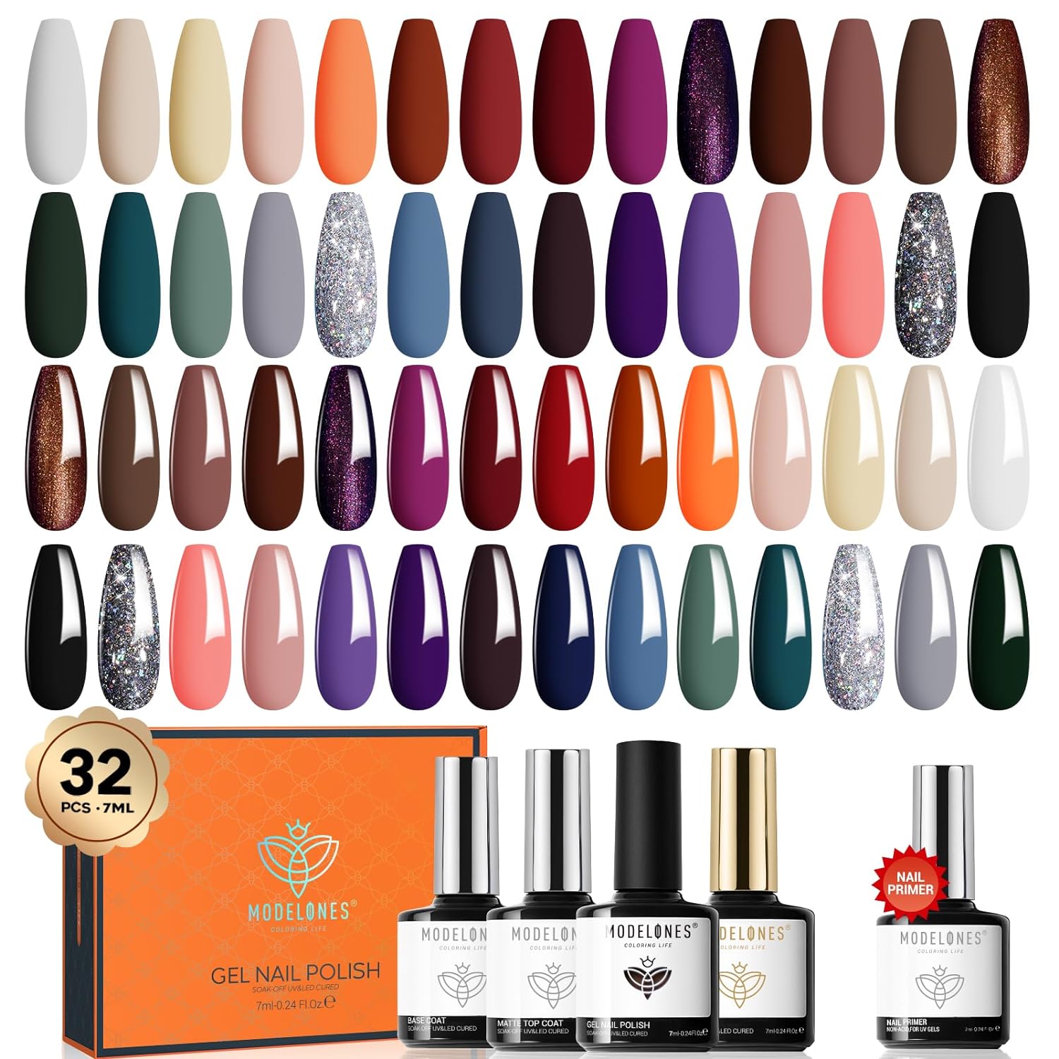 modelones Winter Gel Nail Polish Set, 32 PCS Cat Eye Gel Polish with No Wipe Base & Top Coat and Nail Primer 28 Colors Glitter Black Brown Red Purple Valentine's Day Gifts for Women