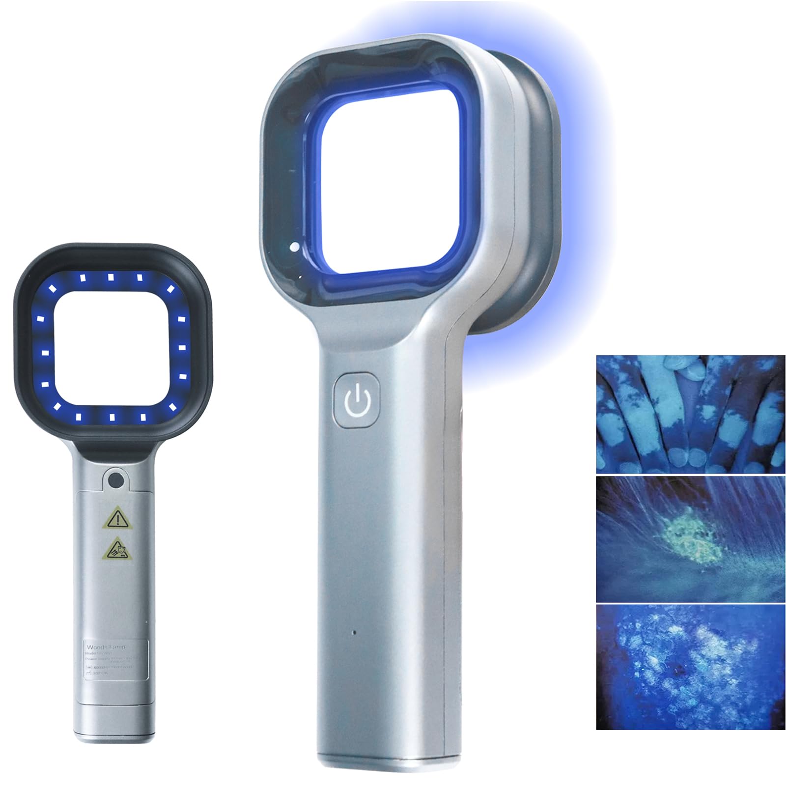 - 【Woods Lamp Skin Analyzer】This portable Woods lamp features 16 365nm LED UV lights, which can penetrate the dermis and detect various skin conditions.Convenient for you to easily detect whether your skin has vitiligo, psoriasis, acne and other skin diseases at home. Woods lamp can also help beauticians better analyze skin conditions and recommend the correct solutions and retail products to customers.