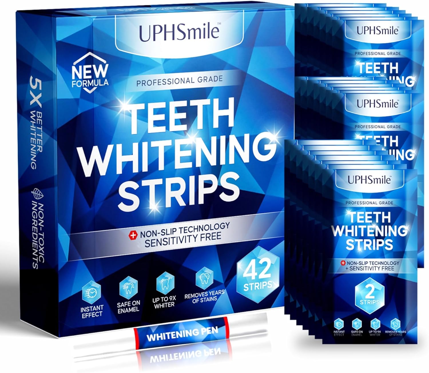 UPHsmile Professional Teeth Whitening Strips - 21 Whitening Sessions - Sensitivity Free - 42 Peroxide Free Whitening Strips - Safe for Enamel 100% Natural-1x2ml Whitening Pen + Mouth Opener Included